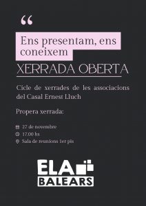 Dentro del ciclo de presentación de asociaciones de Baleares, ELA Balears dio una charla el pasado 27 de noviembre en el Casal Ernest Lluch, en Palma (Mallorca). ANSEDH y ELA Balears trabajan juntas en el grupo de asociaciones Malalties Rares Illes Balears, y por ese motivo, nuestra delegada en las islas acudió a la charla.