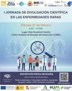 El viernes 27 de febrero nuestra compañera Ana Pineda, soporte de la delegación de Andalucía y Extremadura asistió en el Centro Andaluz de Biología del Desarrollo (CABD) de la Universidad Pablo de Olavide (UPO) de Sevilla a la I Jornada de Divulgación Científica en las enfermedades raras, organizadas por la UPO, el laboratorio de Sánchez- Alcazar en colaboración con la Red de enfermedades raras del CSIC y la Fundación Instituto Biomol.