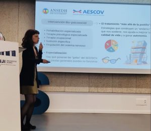 Ruth formó parte de la mesa “Abordaje multidisciplinar e intervención en enfermedades raras”, junto a Abrahán Guirao (Conquistando Escalones, @conquistandoescalones), Ana Solsona (@ana_solsona), enfermera, Raquel Roque (@es_ensintonia), psicóloga, y Luisa Viñals, gestora de casos. Ruth explicó a un público formado por estudiantes sanitarios el impacto del SED y los SCV en la vida de los pacientes. Destacando el duelo que conlleva la pérdida de funcionalidad, el burnout que provoca la gestión de la enfermedad y la necesidad de una atención coordinada y especializada.