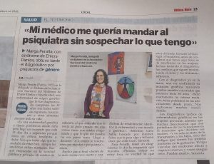 El diario Última Hora ha publicado este domingo 15 de marzo un reportaje dedicado al síndrome de Ehlers-Danlos y a la problemática del retraso diagnóstico en enfermedades raras, a través del testimonio de Marga Peralta, delegada en Baleares de la Asociación Nacional del Síndrome de Ehlers-Danlos e Hiperlaxitud.