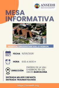 ANSEDH instalará una mesa informativa en el Hospital Universitario Vall d’Hebrón de Barcelona, en horario de 9:00h a 14:00h. Será un espacio abierto para pacientes, familiares y profesionales interesados en conocer mejor la asociación y sus líneas de apoyo, resolver dudas y acceder a información y recursos.