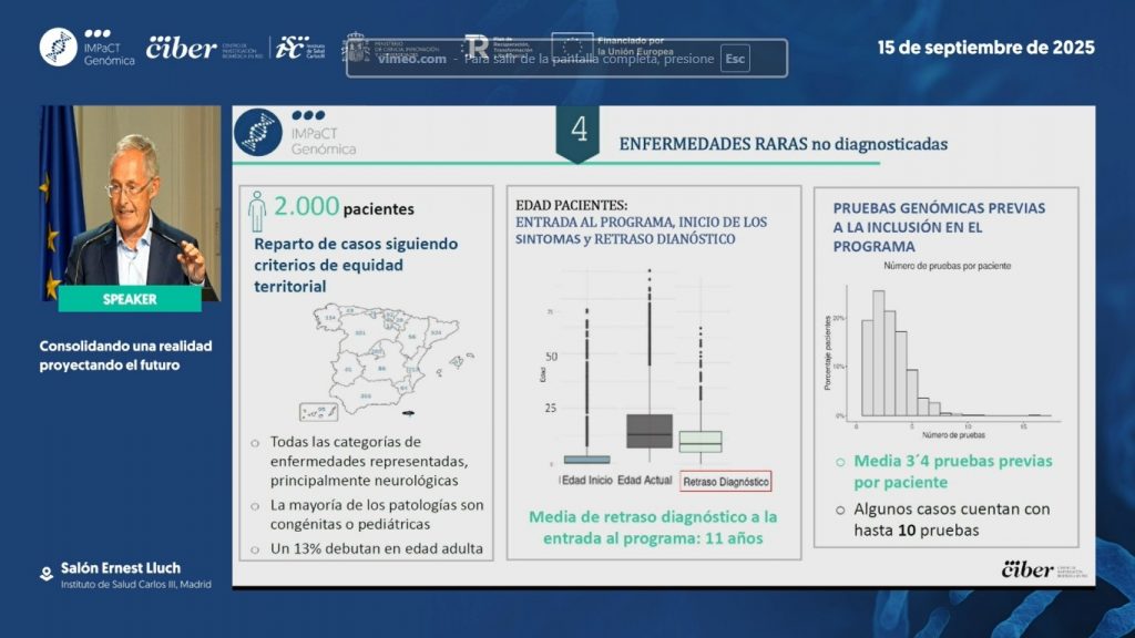 La apertura estuvo a cargo del Dr. Ángel Carracedo, coordinador del proyecto, quien presentó los principales resultados y progresos alcanzados hasta la fecha: «Hemos secuenciado el genoma completo a más de 2000 pacientes con enfermedades raras sin diagnóstico y pacientes con sospecha de cáncer hereditario. En el caso de las enfermedades raras de base genética se ha obtenido un nuevo diagnóstico en el 12% de los casos reanalizando los exomas y un 18% adicional con el análisis del genoma completo, lo que representa un total de alrededor de 30% en pacientes que llevaban esperando una media de 11 años sin diagnóstico. También se ha contribuido al descubrimiento de nuevos genes implicados como los RNU 2-2 involucrados en problemas de neurodesarrollo y epilepsia.”